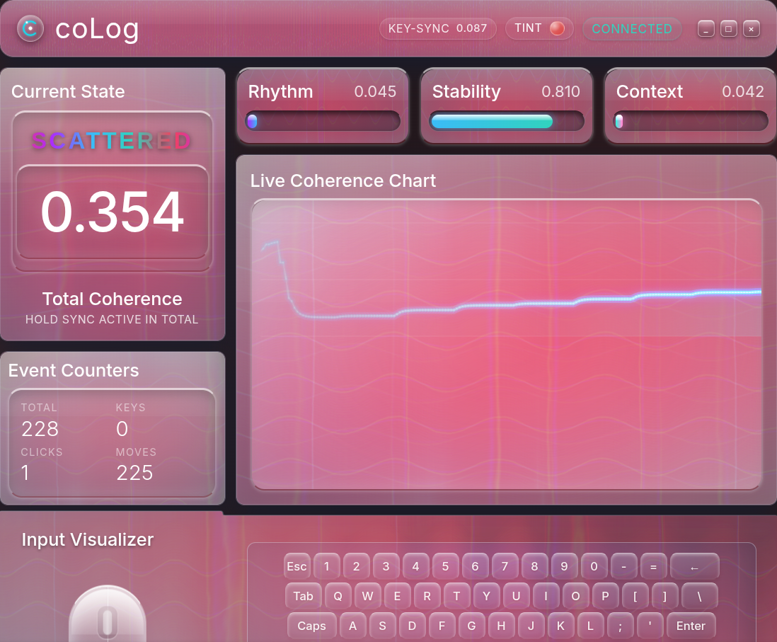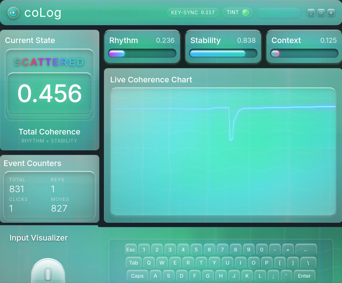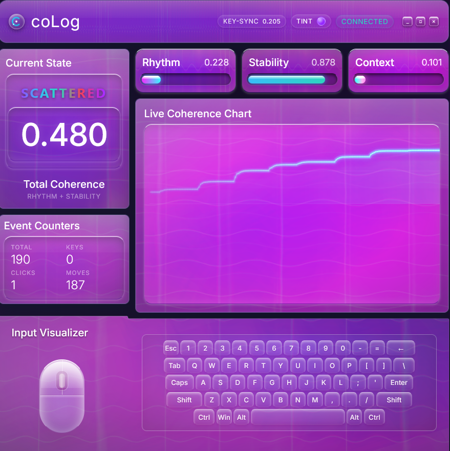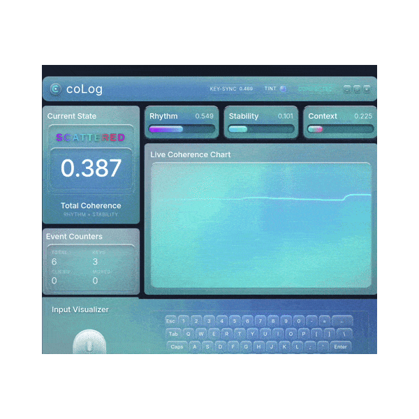 coLog turns raw keyboard and mouse activity into a live coherence dashboard.