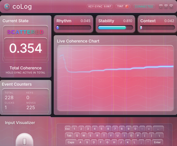 It analyzes how steady, consistent, and coordinated your input is over time, then displays the result as a real-time visual interface with session logging. The interface displays live coherence scores, rhythm/stability metrics, input visualizations, and a scrolling session chart.
